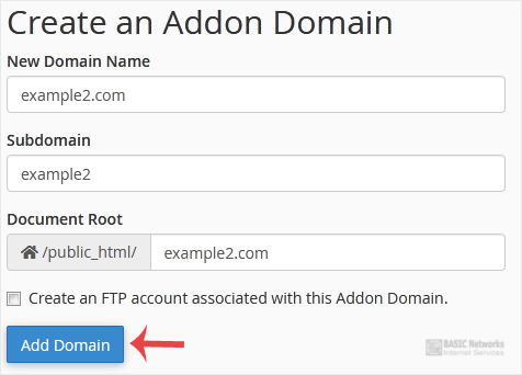 New Domain Name: Your Addon domain name, such as example2.com.