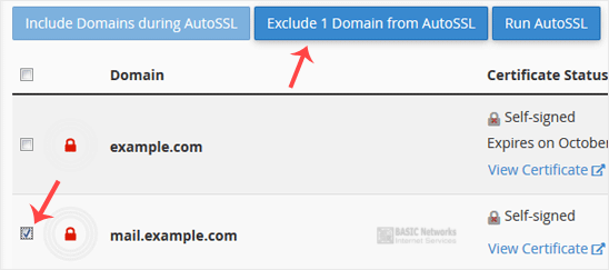 1. Under Domain, check-mark the domains you want to exclude and click "Exclude X domains during AutoSSL." Selected domains/subdomains will be excluded from AutoSSL.