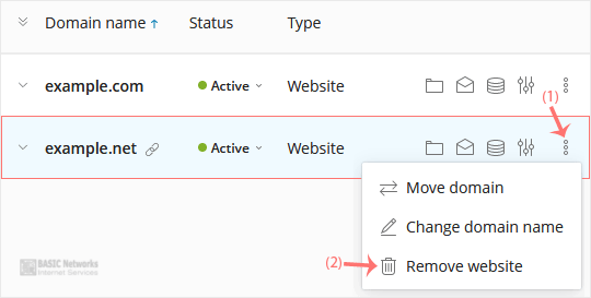3. Under the list of domains, click on the More icon in front of the domain and select Remove website.
